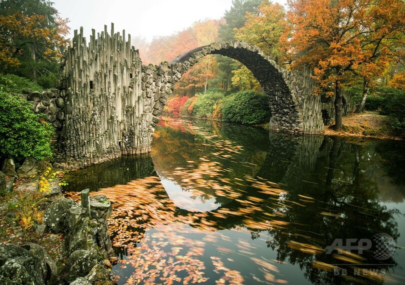 【10月29日 AFP】ドイツ東部クロムラウ(Kromlau)のロドデンドロン(Rhododendron、シャクナゲ)公園にあるラコツブルッカ(Rakotzbruecke)橋は、湖面に反射して円を映し出すことで有名だ。