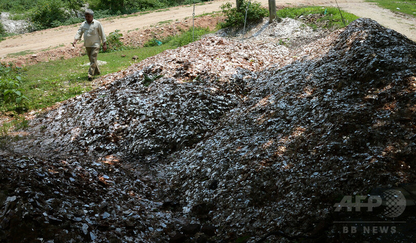 【11月2日 AFP】顔に泥がこびりつき、髪の毛は汗で固まったラリタ・クマリ(Lalita Kumari)さん(8)は、口紅やマニキュアに加えてきらめきを出すパール顔料の原料を含んだ石をたたき割っている。