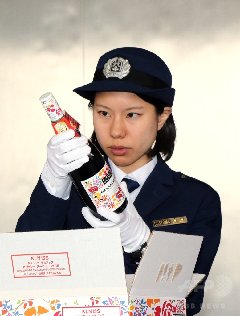 【10月31日 AFP】仏ボージョレ(Beaujolais)産ワインの新酒「ボージョレ・ヌーボー(Beaujolais Nouveau)」の初荷が31日、羽田空港(Haneda Airport)に到着し、税関職員が仏パリ(Paris)から届いた約3200本のボトルの検査を行った。今年の解禁日は11月19日。(c)AFP