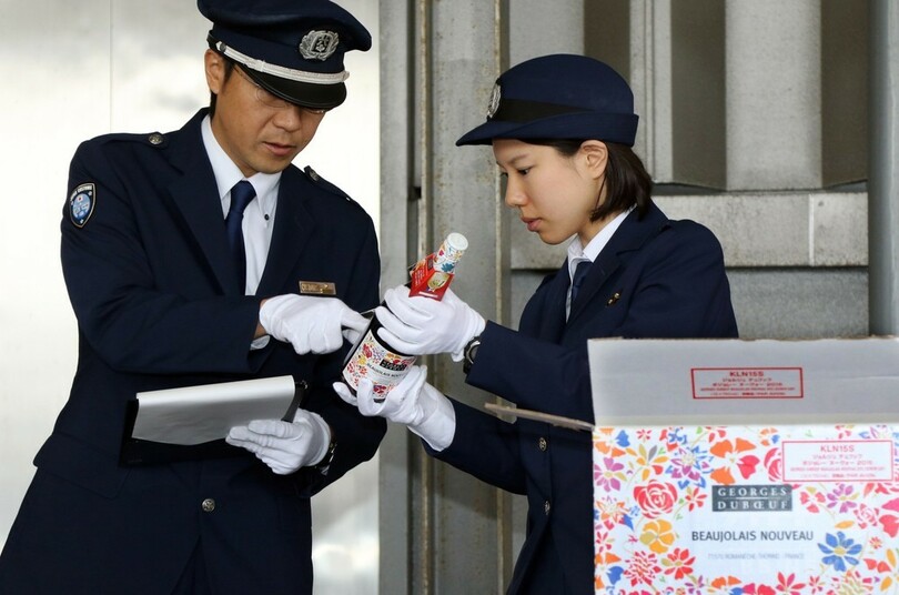 【10月31日 AFP】仏ボージョレ(Beaujolais)産ワインの新酒「ボージョレ・ヌーボー(Beaujolais Nouveau)」の初荷が31日、羽田空港(Haneda Airport)に到着し、税関職員が仏パリ(Paris)から届いた約3200本のボトルの検査を行った。今年の解禁日は11月19日。(c)AFP