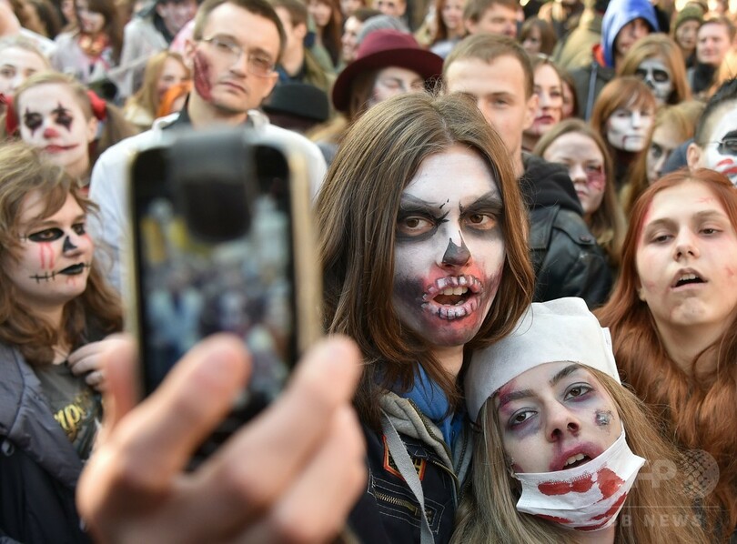 ウクライナの首都キエフ(Kiev)では、ハロウィーンに合わせてゾンビウオークが行われた他、コソボの米軍キャンプでは前日にハロウィーンのパーティーが行われ仮装した兵士らの姿が見られた。(c)AFP