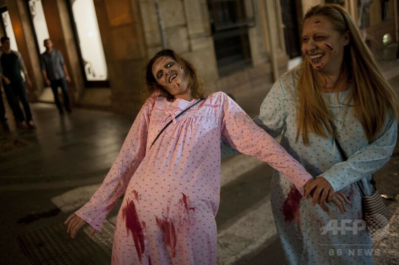 【11月1日 AFP】ハロウィーンの10月31日夜、世界各地の街角などでお化けやゾンビなど、さまざまな衣装や特殊メークで仮装した人々が見られた。
