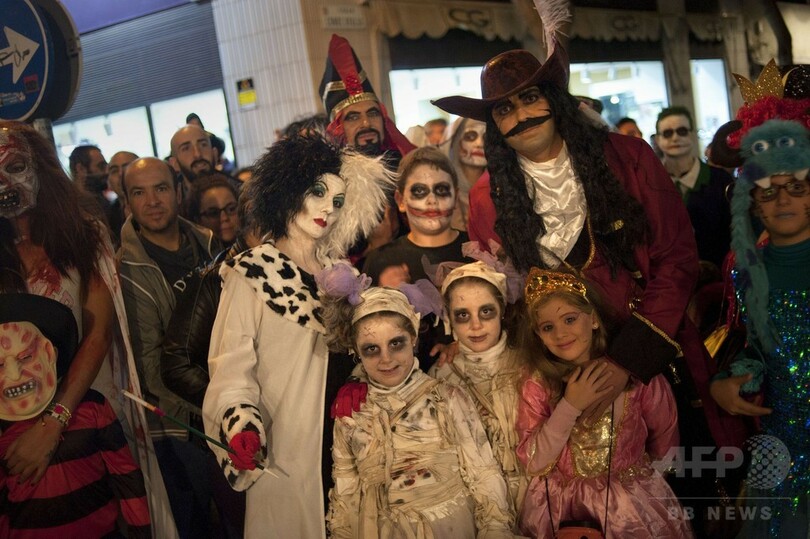 【11月1日 AFP】ハロウィーンの10月31日夜、世界各地の街角などでお化けやゾンビなど、さまざまな衣装や特殊メークで仮装した人々が見られた。