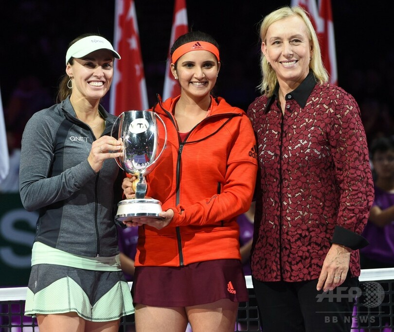 ミルザは、カーラ・ブラック(Cara Black、ジンバブエ)と組んだ昨年に続く、WTAツアー選手権ダブルス連覇を達成。一方のヒンギスは、女子ダブルスで通算50個目のタイトルを獲得した。(c)AFP
