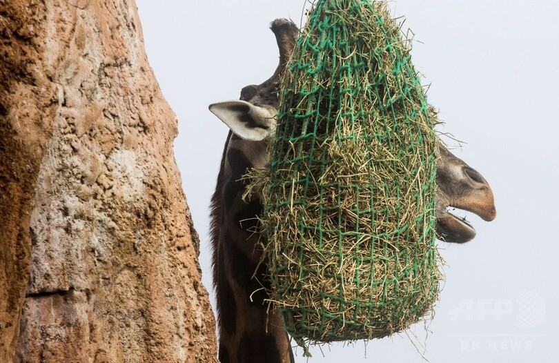 【11月4日 AFP】ドイツ西部フランクフルト・アムマイン(Frankfurt am Main)近郊のクロンベルク(Kronberg)にあるオペル動物園(Opel-Zoo)で、木につり下げられた干し草のネットのちょうど真後ろにいるキリン。(c)AFP