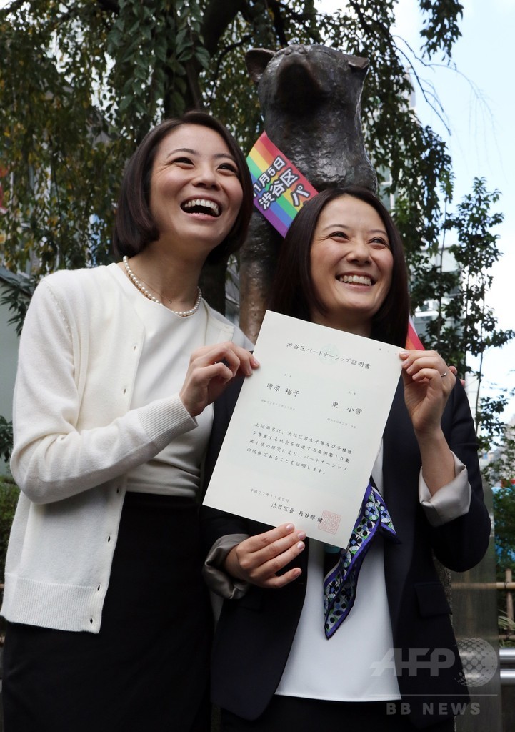 【11月5日 AFP】東京都渋谷区は5日、同性カップルを結婚に相当する関係と認める「パートナーシップ証明書」の交付を開始した。