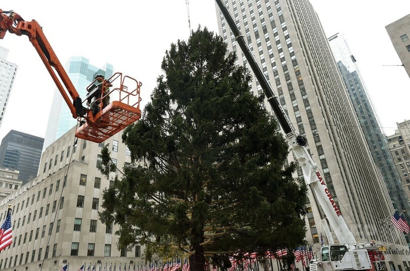 【11月7日 AFP】米ニューヨーク(New York)のロックフェラーセンター(Rockefeller Center)に6日、クレーン車でクリスマスツリーが設置された。今年のクリスマスツリーに使われたトウヒは高さ24メートル、直径14メートルで、ロックフェラーセンターに設置されたクリスマスツリーとしては過去最大。(c)AFP
