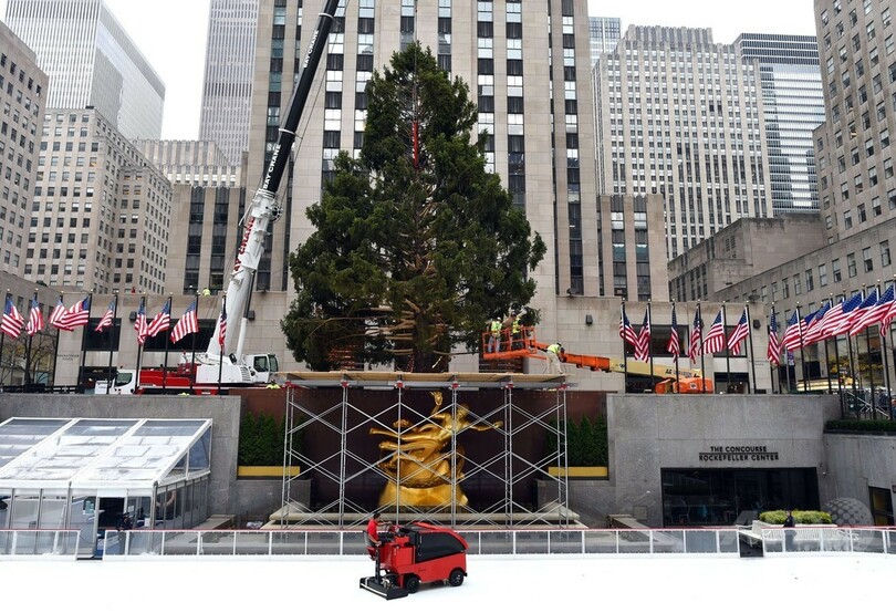 【11月7日 AFP】米ニューヨーク(New York)のロックフェラーセンター(Rockefeller Center)に6日、クレーン車でクリスマスツリーが設置された。今年のクリスマスツリーに使われたトウヒは高さ24メートル、直径14メートルで、ロックフェラーセンターに設置されたクリスマスツリーとしては過去最大。(c)AFP