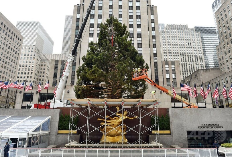 【11月7日 AFP】米ニューヨーク(New York)のロックフェラーセンター(Rockefeller Center)に6日、クレーン車でクリスマスツリーが設置された。今年のクリスマスツリーに使われたトウヒは高さ24メートル、直径14メートルで、ロックフェラーセンターに設置されたクリスマスツリーとしては過去最大。(c)AFP