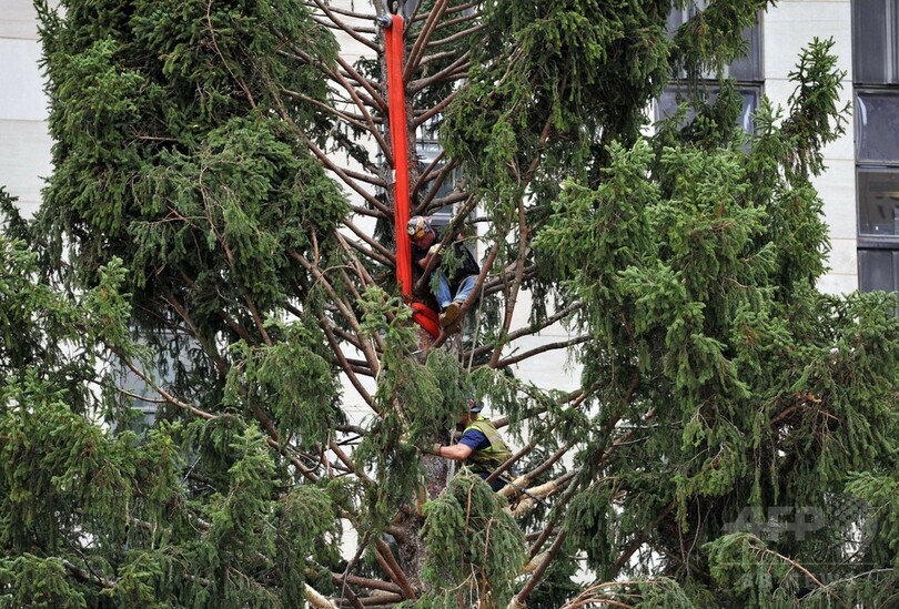 【11月7日 AFP】米ニューヨーク(New York)のロックフェラーセンター(Rockefeller Center)に6日、クレーン車でクリスマスツリーが設置された。今年のクリスマスツリーに使われたトウヒは高さ24メートル、直径14メートルで、ロックフェラーセンターに設置されたクリスマスツリーとしては過去最大。(c)AFP