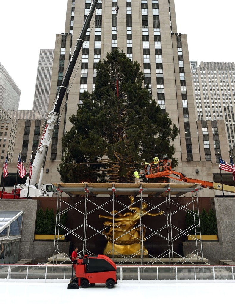 【11月7日 AFP】米ニューヨーク(New York)のロックフェラーセンター(Rockefeller Center)に6日、クレーン車でクリスマスツリーが設置された。今年のクリスマスツリーに使われたトウヒは高さ24メートル、直径14メートルで、ロックフェラーセンターに設置されたクリスマスツリーとしては過去最大。(c)AFP