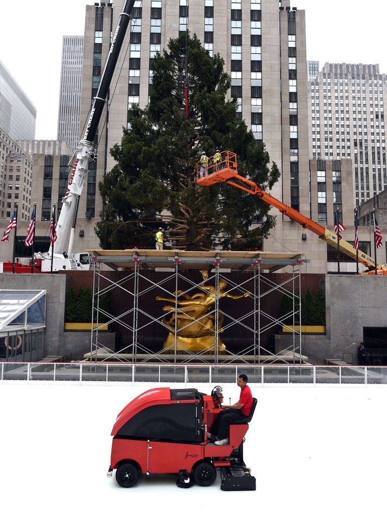 【11月7日 AFP】米ニューヨーク(New York)のロックフェラーセンター(Rockefeller Center)に6日、クレーン車でクリスマスツリーが設置された。今年のクリスマスツリーに使われたトウヒは高さ24メートル、直径14メートルで、ロックフェラーセンターに設置されたクリスマスツリーとしては過去最大。(c)AFP