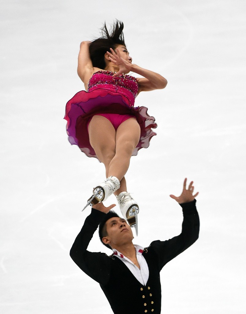 ロシアの川口悠子(Yuko Kawaguchi)/アレクサンドル・スミルノフ(Alexander Smirnov)組が72.45点で2位につけ、中国の于小雨(Yu Xiaoyu)/金揚(Jin Yang)組が70.06点で3位に続いている。(c)AFP