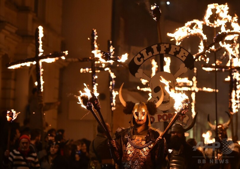 大勢の人々がたいまつを掲げて通りを練り歩き、最後は人形が火に投げ込まれる。この人形は通常、1605年に国会議事堂の爆破未遂事件を引き起こし死刑に処されたガイ・フォークス(Guy Fawkes)をモデルにしている。(c)AFP
