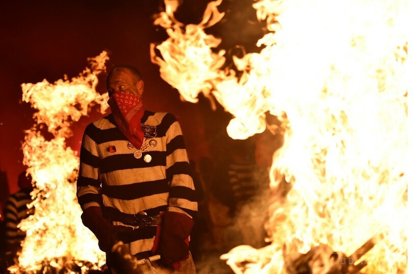 大勢の人々がたいまつを掲げて通りを練り歩き、最後は人形が火に投げ込まれる。この人形は通常、1605年に国会議事堂の爆破未遂事件を引き起こし死刑に処されたガイ・フォークス(Guy Fawkes)をモデルにしている。(c)AFP