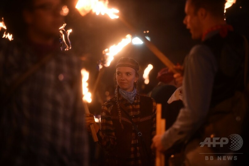 大勢の人々がたいまつを掲げて通りを練り歩き、最後は人形が火に投げ込まれる。この人形は通常、1605年に国会議事堂の爆破未遂事件を引き起こし死刑に処されたガイ・フォークス(Guy Fawkes)をモデルにしている。(c)AFP