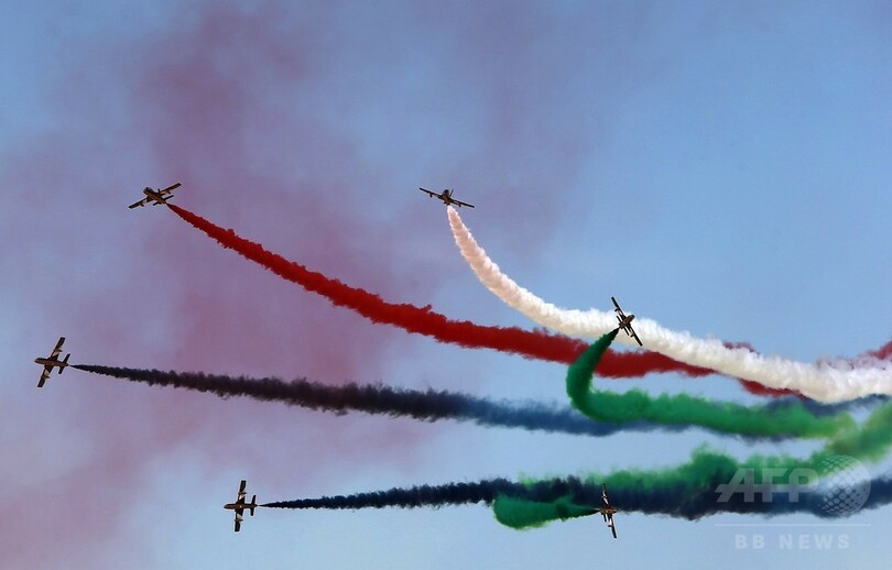 【11月9日 AFP】アラブ首長国連邦(UAE)のドバイ(Dubai)で8日、2年ごとに開催されるドバイ航空ショー(Dubai Airshow)が開幕し、同国空軍のアクロバット飛行チーム「アル・フルサン(Al-Fursan)」をはじめとする各国のチームによる曲芸飛行や、各社の戦闘機による展示飛行などが行われた。前回のような大型発注の見込みは薄いとされる中、穏やかな出足となった。(c)AFP