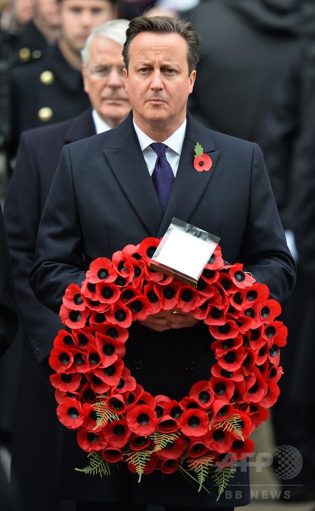 式典では、エリザベス女王(Queen Elizabeth II、89)とデービッド・キャメロン(David Cameron)英首相をはじめ王族と閣僚らが、大勢の退役軍人らが見守る中で献花した。