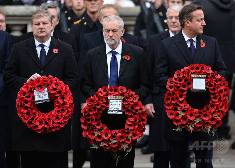 式典では、エリザベス女王(Queen Elizabeth II、89)とデービッド・キャメロン(David Cameron)英首相をはじめ王族と閣僚らが、大勢の退役軍人らが見守る中で献花した。