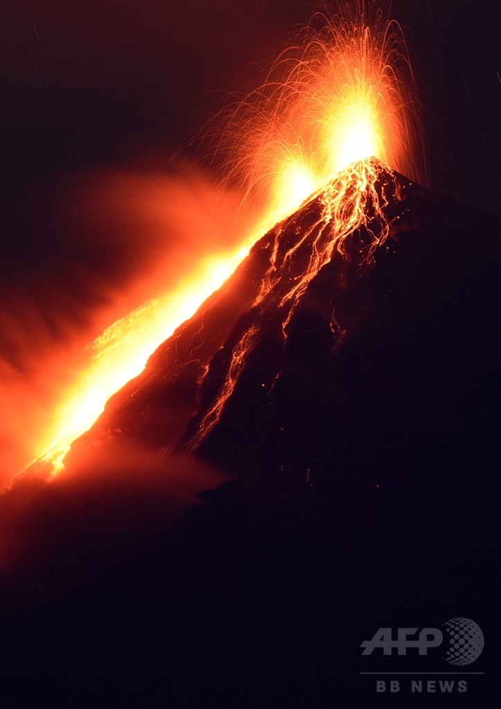 スペイン植民地時代の都市アンティグア(Antigua)に近く、首都グアテマラ市(Guatemala City)の約40キロ南西に位置するフエゴ火山は、夜間にかけて活動を活発化。噴煙が上空高く上がり、溶岩が山の斜面を流れ下ったほか、小規模な地震も観測された。同火山はスペイン語で「火」を意味する。
