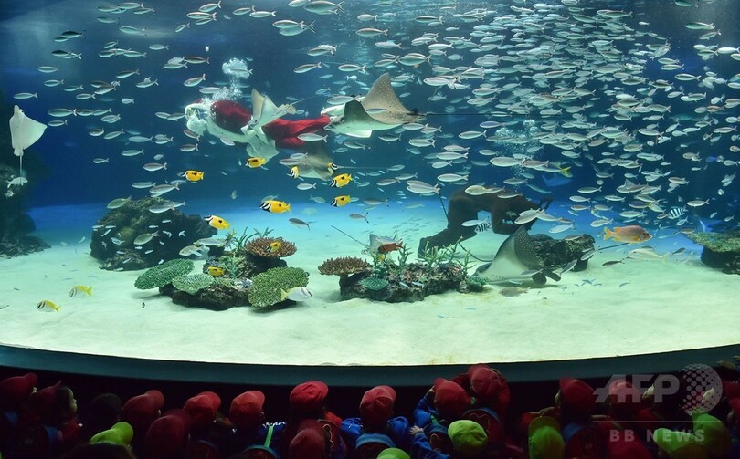 【11月13日 AFP】東京・池袋のサンシャイン水族館(Sunshine Aquarium)で12日、クリスマスの特別イベントが始まり、サンタクロース姿のダイバーが水槽の中で魚と泳ぎ、来場者を楽しませた。