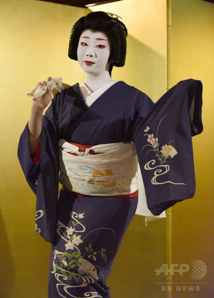 祇園(Gion)のお茶屋でAFPの取材に応じた芸妓の菊丸(Kikumaru)さん(31)は、「(芸舞妓は)周りに与えるイメージに非常に気を遣わなければならない」と話す。京都には現在、芸妓が175人いるという。