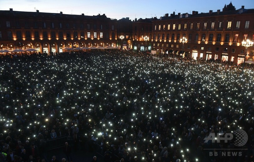 【11月18日 AFP】フランス南部トゥールーズ(Toulouse)のキャピトル広場(Capitol square)で17日、パリ(Paris)で13日に発生した連続襲撃事件の犠牲者を追悼する集会が行われ、大勢の人々が明かりを手にして参加した。今回の事件では129人が死亡、352人が負傷した。(c)AFP