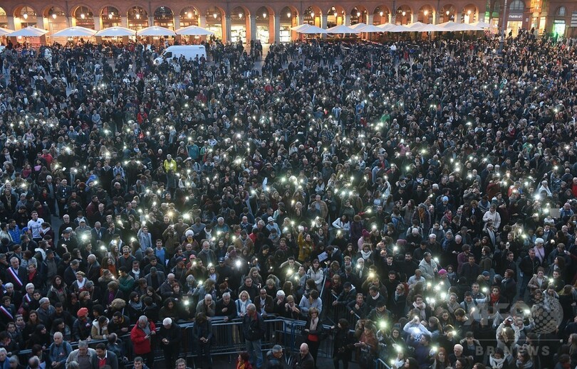 【11月18日 AFP】フランス南部トゥールーズ(Toulouse)のキャピトル広場(Capitol square)で17日、パリ(Paris)で13日に発生した連続襲撃事件の犠牲者を追悼する集会が行われ、大勢の人々が明かりを手にして参加した。今回の事件では129人が死亡、352人が負傷した。(c)AFP