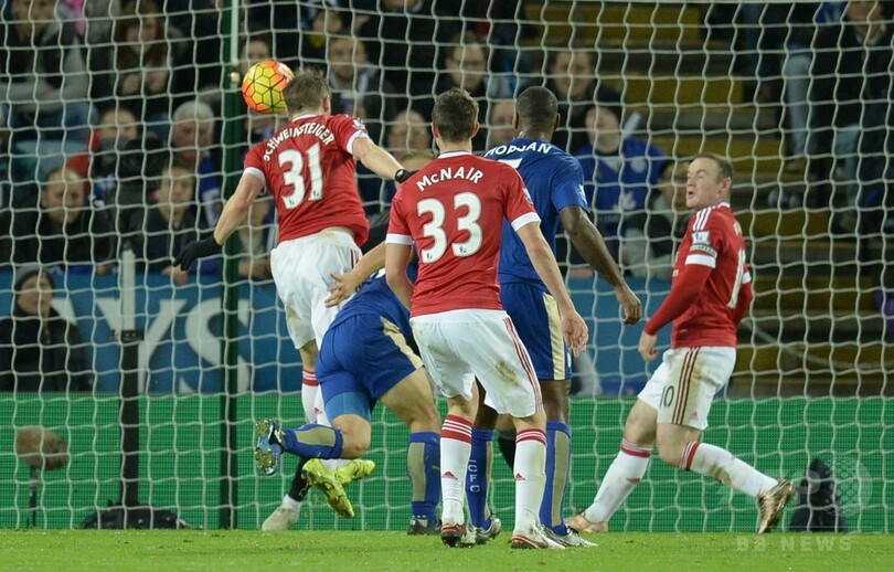 それでもユナイテッドは、ハーフタイム直前にデリー・ブリント(Daley Blind)の右CKからシュバインシュタイガーが同点ゴールを決めた。シュバインシュタイガーは岡崎慎司(Shinji Okazaki)のマークをものともせずに振り切り、至近距離からヘディングシュートを放ってシュマイケルを打ち破った。(c)AFP