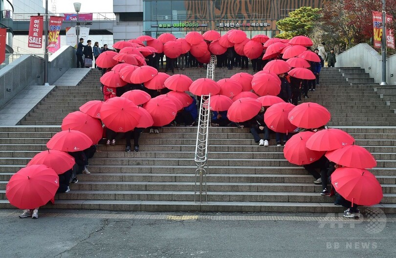 【12月1日 AFP】1日の「世界エイズデー(World AIDS Day)」にあわせ、世界で啓発運動やさまざまなイベントが開かれた。韓国ソウル(Seoul)では、中学生らが赤い傘を広げてエイズ啓発運動の象徴である「レッドリボン」をかたどり、米ニューヨーク(New York)では11月30日、エンパイアステートビル(Empire State Building)が赤色にライトアップされた。(c)AFP