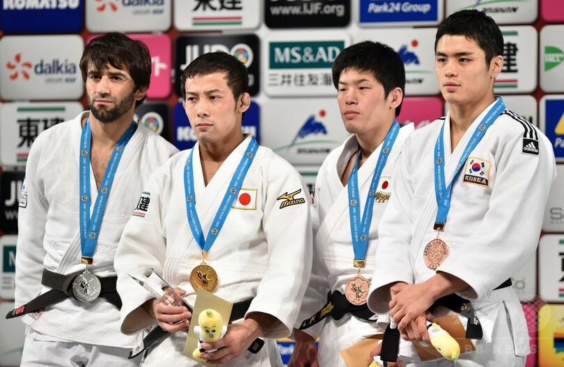 男子60キロ級は髙藤直寿(Naohisa Takato)が金メダルを手にし、男子66キロ級では海老沼匡(Masashi Ebinuma)を破った髙上智史(Tomofumi Takajo)が優勝を果たした。(c)AFP