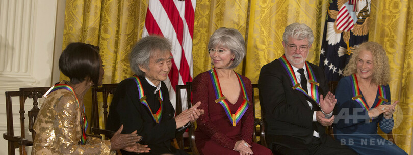 【12月7日 AFP】米首都ワシントン(Washington D.C.)のホワイトハウス(White House)で6日、米国の文化・芸能分野で素晴らしい功績を残した人びとに贈られる第38回ケネディ・センター名誉賞(Kennedy Center Honors)の授賞式が行われた。今年は指揮者の小澤征爾(Seiji Ozawa)さん、映画監督のジョージ・ルーカス(George Lucas)さん、女優でブロードウェースターのシシリー・タイソン(Cicely Tyson)さん、女優で歌手のリタ・モレノ(Rita Moreno)さん、シンガー・ソングライターのキャロル・キング(Carole King)さんの5人が受賞した。(c)AFP