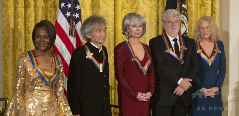 【12月7日 AFP】米首都ワシントン(Washington D.C.)のホワイトハウス(White House)で6日、米国の文化・芸能分野で素晴らしい功績を残した人びとに贈られる第38回ケネディ・センター名誉賞(Kennedy Center Honors)の授賞式が行われた。今年は指揮者の小澤征爾(Seiji Ozawa)さん、映画監督のジョージ・ルーカス(George Lucas)さん、女優でブロードウェースターのシシリー・タイソン(Cicely Tyson)さん、女優で歌手のリタ・モレノ(Rita Moreno)さん、シンガー・ソングライターのキャロル・キング(Carole King)さんの5人が受賞した。(c)AFP