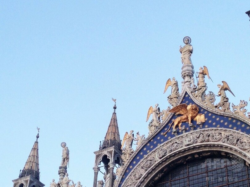 今回の修復は、「ヴェネチア保護のためのフランス委員会」のプロジェクトの一環として行われ、サンマルコ大聖堂のペディメントに位置する黄金の獅子像と、その後ろに配されたゴールドの星が輝くブルーのモザイクを、「シャネル」の支援により2つのチームが数ヶ月もの時間をかけ修復した。(c)MODE PRESS