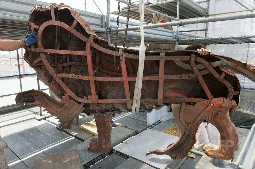 今回の修復は、「ヴェネチア保護のためのフランス委員会」のプロジェクトの一環として行われ、サンマルコ大聖堂のペディメントに位置する黄金の獅子像と、その後ろに配されたゴールドの星が輝くブルーのモザイクを、「シャネル」の支援により2つのチームが数ヶ月もの時間をかけ修復した。(c)MODE PRESS