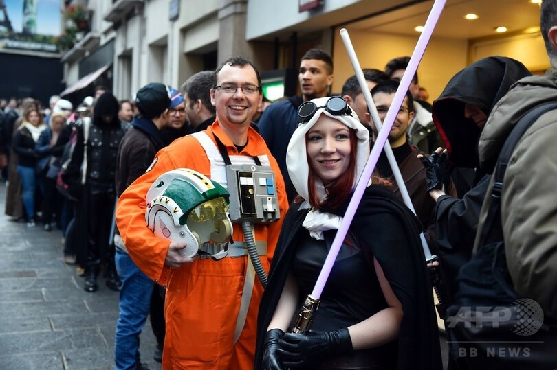 【12月17日 AFP】人気SF映画「スター・ウォーズ(Star Wars)」シリーズの最新作『スター・ウォーズ/フォースの覚醒(Star Wars: The Force Awakens)』の公開がいよいよ週末に迫り、世界各地で待ちかねたファンたちがお祭り騒ぎを繰り広げている。英国やフランスなど一部の国では16日にプレミア先行上映が行われ、登場人物に扮(ふん)した大勢のファンたちが詰めかけた。(c)AFP