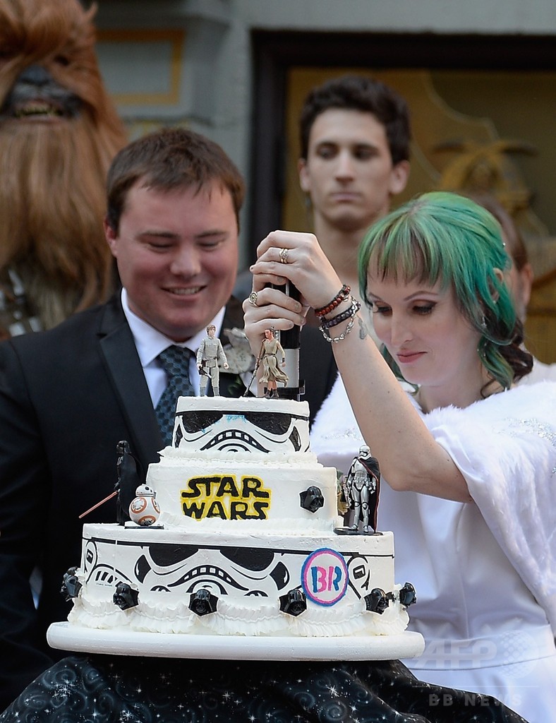 【12月18日 AFP】米ロサンゼルス(Los Angeles)・ハリウッド(Hollywood)地区にある劇場「TCLチャイニーズ・シアター(TCL Chinese Theater)」前で17日、公開間近に迫った人気SF映画「スター・ウォーズ(Star Wars)」シリーズの最新作『スター・ウォーズ/フォースの覚醒(Star Wars: The Force Awakens)』を鑑賞するために行列に並んでいたファン同士のオーストラリア人カップルが、同シリーズをテーマにした結婚式を挙げた。