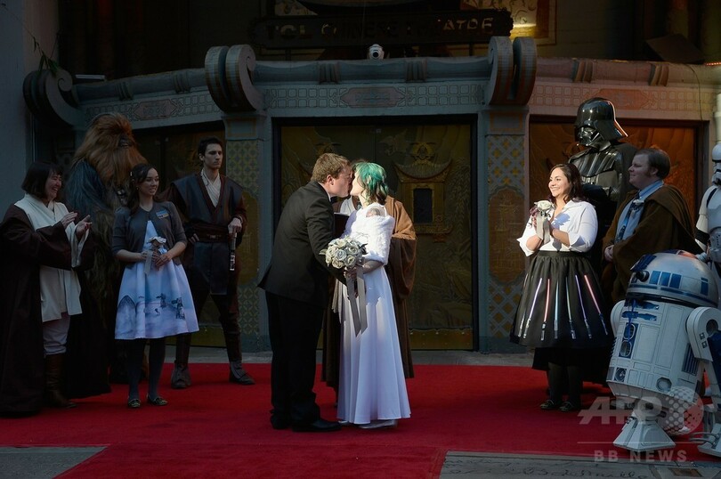 【12月18日 AFP】米ロサンゼルス(Los Angeles)・ハリウッド(Hollywood)地区にある劇場「TCLチャイニーズ・シアター(TCL Chinese Theater)」前で17日、公開間近に迫った人気SF映画「スター・ウォーズ(Star Wars)」シリーズの最新作『スター・ウォーズ/フォースの覚醒(Star Wars: The Force Awakens)』を鑑賞するために行列に並んでいたファン同士のオーストラリア人カップルが、同シリーズをテーマにした結婚式を挙げた。