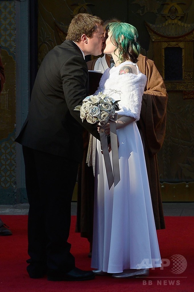 【12月18日 AFP】米ロサンゼルス(Los Angeles)・ハリウッド(Hollywood)地区にある劇場「TCLチャイニーズ・シアター(TCL Chinese Theater)」前で17日、公開間近に迫った人気SF映画「スター・ウォーズ(Star Wars)」シリーズの最新作『スター・ウォーズ/フォースの覚醒(Star Wars: The Force Awakens)』を鑑賞するために行列に並んでいたファン同士のオーストラリア人カップルが、同シリーズをテーマにした結婚式を挙げた。