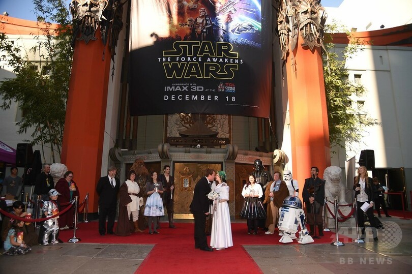 【12月18日 AFP】米ロサンゼルス(Los Angeles)・ハリウッド(Hollywood)地区にある劇場「TCLチャイニーズ・シアター(TCL Chinese Theater)」前で17日、公開間近に迫った人気SF映画「スター・ウォーズ(Star Wars)」シリーズの最新作『スター・ウォーズ/フォースの覚醒(Star Wars: The Force Awakens)』を鑑賞するために行列に並んでいたファン同士のオーストラリア人カップルが、同シリーズをテーマにした結婚式を挙げた。