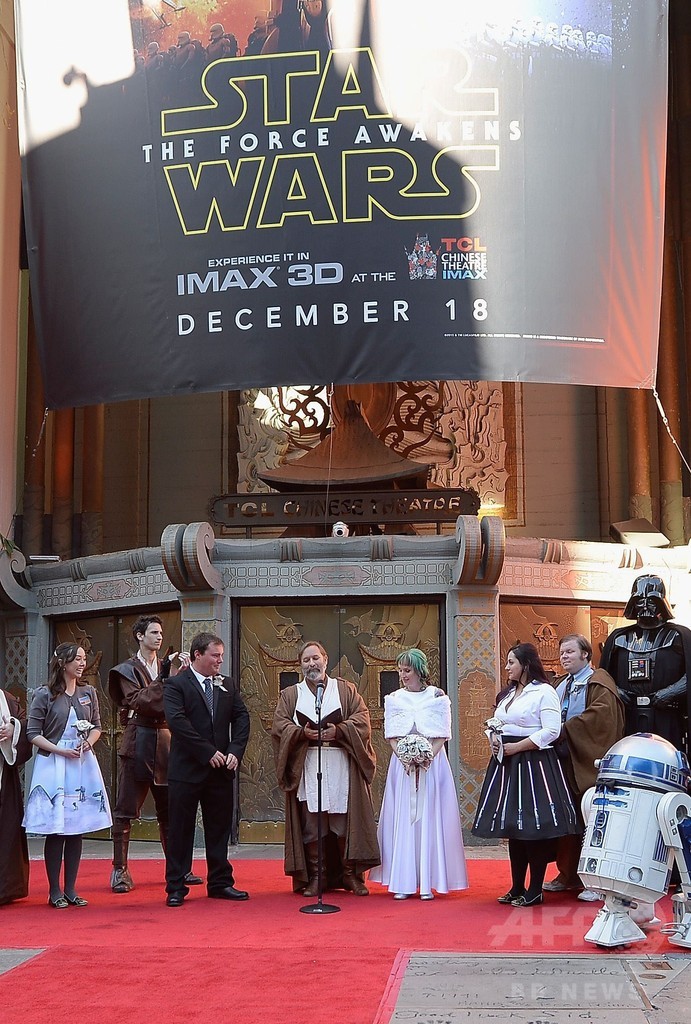 【12月18日 AFP】米ロサンゼルス(Los Angeles)・ハリウッド(Hollywood)地区にある劇場「TCLチャイニーズ・シアター(TCL Chinese Theater)」前で17日、公開間近に迫った人気SF映画「スター・ウォーズ(Star Wars)」シリーズの最新作『スター・ウォーズ/フォースの覚醒(Star Wars: The Force Awakens)』を鑑賞するために行列に並んでいたファン同士のオーストラリア人カップルが、同シリーズをテーマにした結婚式を挙げた。