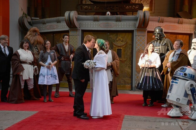 【12月18日 AFP】米ロサンゼルス(Los Angeles)・ハリウッド(Hollywood)地区にある劇場「TCLチャイニーズ・シアター(TCL Chinese Theater)」前で17日、公開間近に迫った人気SF映画「スター・ウォーズ(Star Wars)」シリーズの最新作『スター・ウォーズ/フォースの覚醒(Star Wars: The Force Awakens)』を鑑賞するために行列に並んでいたファン同士のオーストラリア人カップルが、同シリーズをテーマにした結婚式を挙げた。