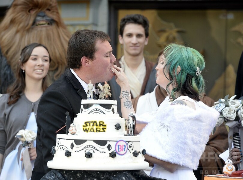 【12月18日 AFP】米ロサンゼルス(Los Angeles)・ハリウッド(Hollywood)地区にある劇場「TCLチャイニーズ・シアター(TCL Chinese Theater)」前で17日、公開間近に迫った人気SF映画「スター・ウォーズ(Star Wars)」シリーズの最新作『スター・ウォーズ/フォースの覚醒(Star Wars: The Force Awakens)』を鑑賞するために行列に並んでいたファン同士のオーストラリア人カップルが、同シリーズをテーマにした結婚式を挙げた。