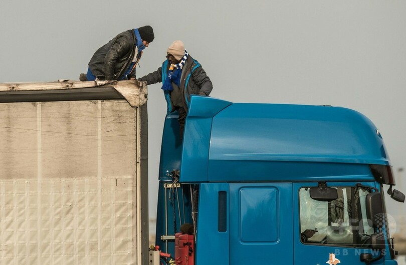 現場のAFP記者も、英国に向かうトラックの上に若者たちが登ったり、防水シートを切って荷台に潜り込もうとしたりする姿を目撃した。複数の移民がトンネル内に入るのに成功したという。(c)AFP