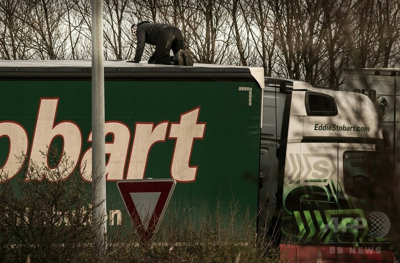 現場のAFP記者も、英国に向かうトラックの上に若者たちが登ったり、防水シートを切って荷台に潜り込もうとしたりする姿を目撃した。複数の移民がトンネル内に入るのに成功したという。(c)AFP