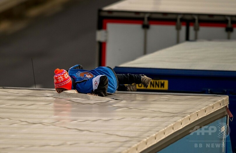 現場のAFP記者も、英国に向かうトラックの上に若者たちが登ったり、防水シートを切って荷台に潜り込もうとしたりする姿を目撃した。複数の移民がトンネル内に入るのに成功したという。(c)AFP