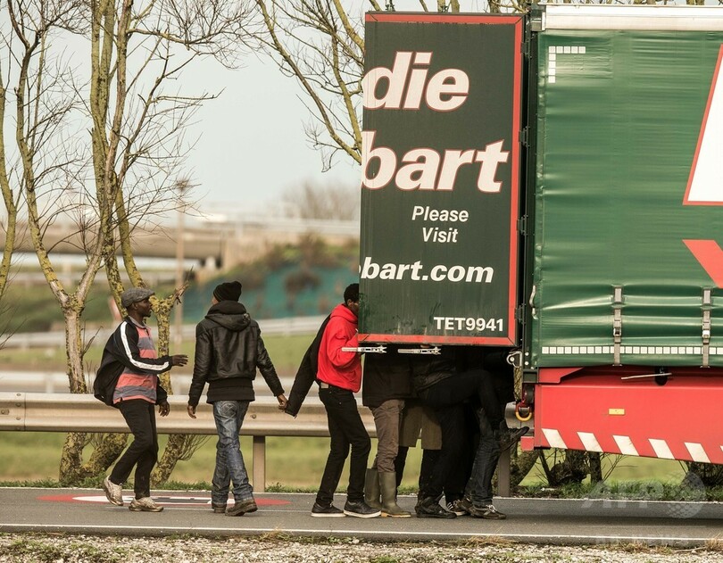 現場のAFP記者も、英国に向かうトラックの上に若者たちが登ったり、防水シートを切って荷台に潜り込もうとしたりする姿を目撃した。複数の移民がトンネル内に入るのに成功したという。(c)AFP
