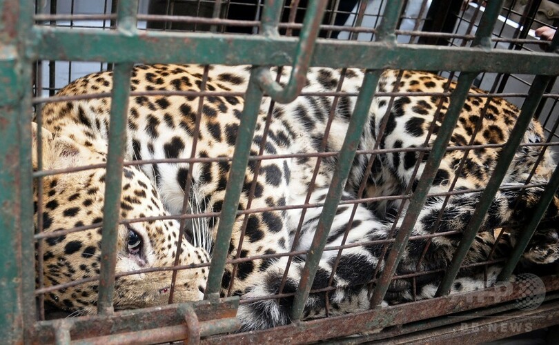 ヒョウは麻酔をかけられておりに入れられ、アッサム州立動物園(Assam State Zoo)に運ばれた。(c)AFP