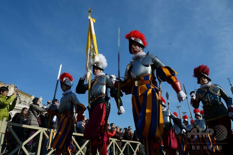 【12月25日 AFP】バチカンのサンピエトロ広場(St Peter's Square)で25日、ローマ・カトリック教会のフランシスコ(Francis)法王が毎年恒例となっているクリスマスメッセージ「ウルビ・エト・オルビ(Urbi et Orbi)」(ローマと全世界へ)を読み上げるのを前に、スイス衛兵がパレードを行った。(c)AFP
