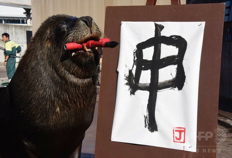 また、アシカの仲間のオタリアも、新年のイベントに向け、来年のえと「申(さる)」の書き初めの練習をした。